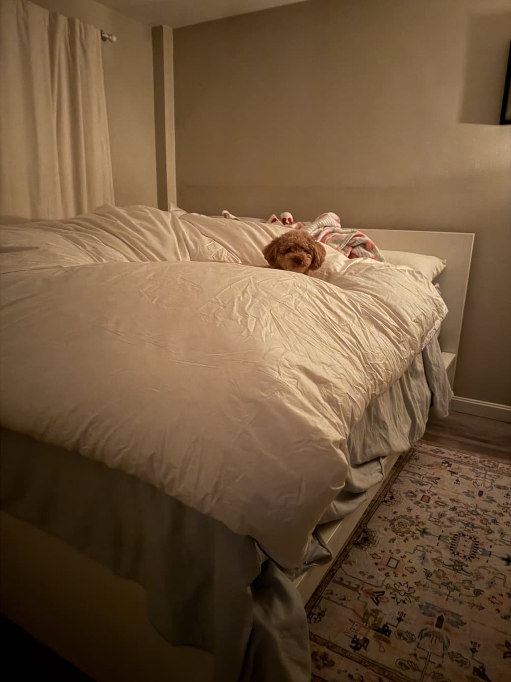 This comforter is amazing! We bought the double mega fluff. My only problem is the fluff isn’t evenly distributed. The middle has no fluff and it all goes towards the outside. Does anyone have any recommendations to fix this? My dog loved it the most! Try to find the pup on the duvet! lol